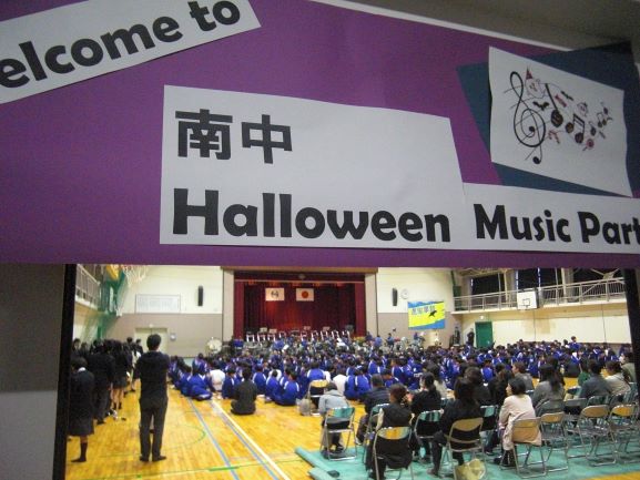 演奏の後半では、ピュアブラスさんと本校吹奏楽部のコラボレーションによる合奏が行われました。ハロウィンにちなんだ装飾での演奏と、皆さんの手拍子が体育館に響きわたり、演奏に魅了されました。