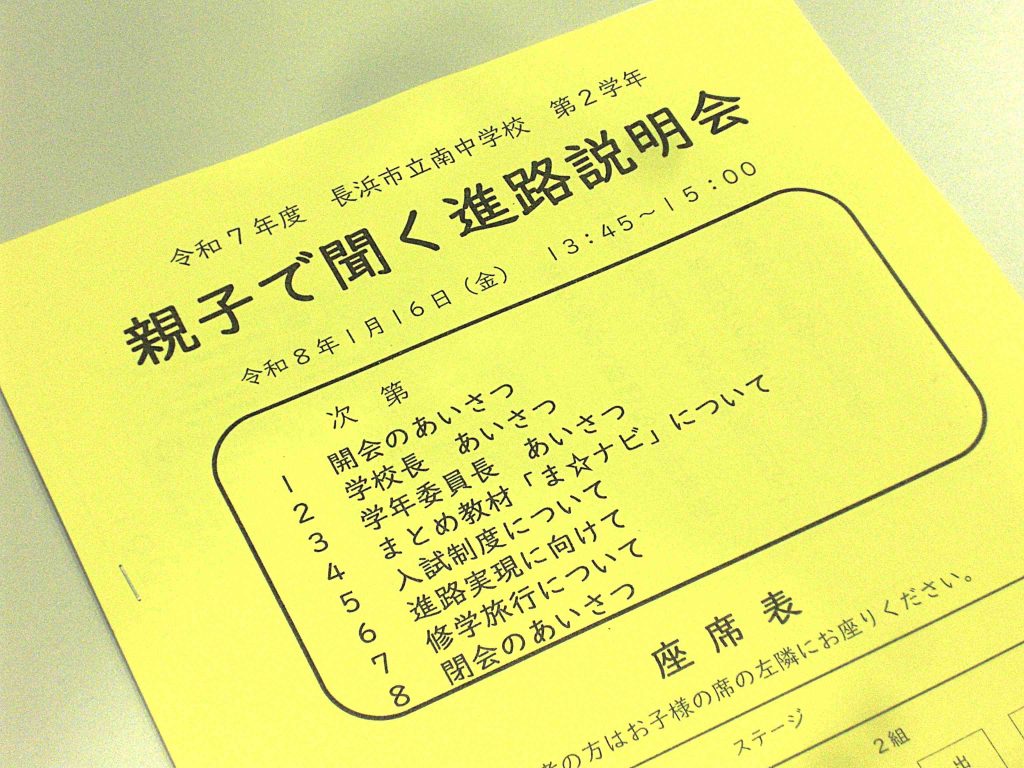 今年度の3年生から滋賀県立高等学校の入試制度が大きく変わっています。新制度の概略について説明を行うと同時に、よりよい進路選択に向けて保護者の方とともに卒業後の進路について考える機会としました。