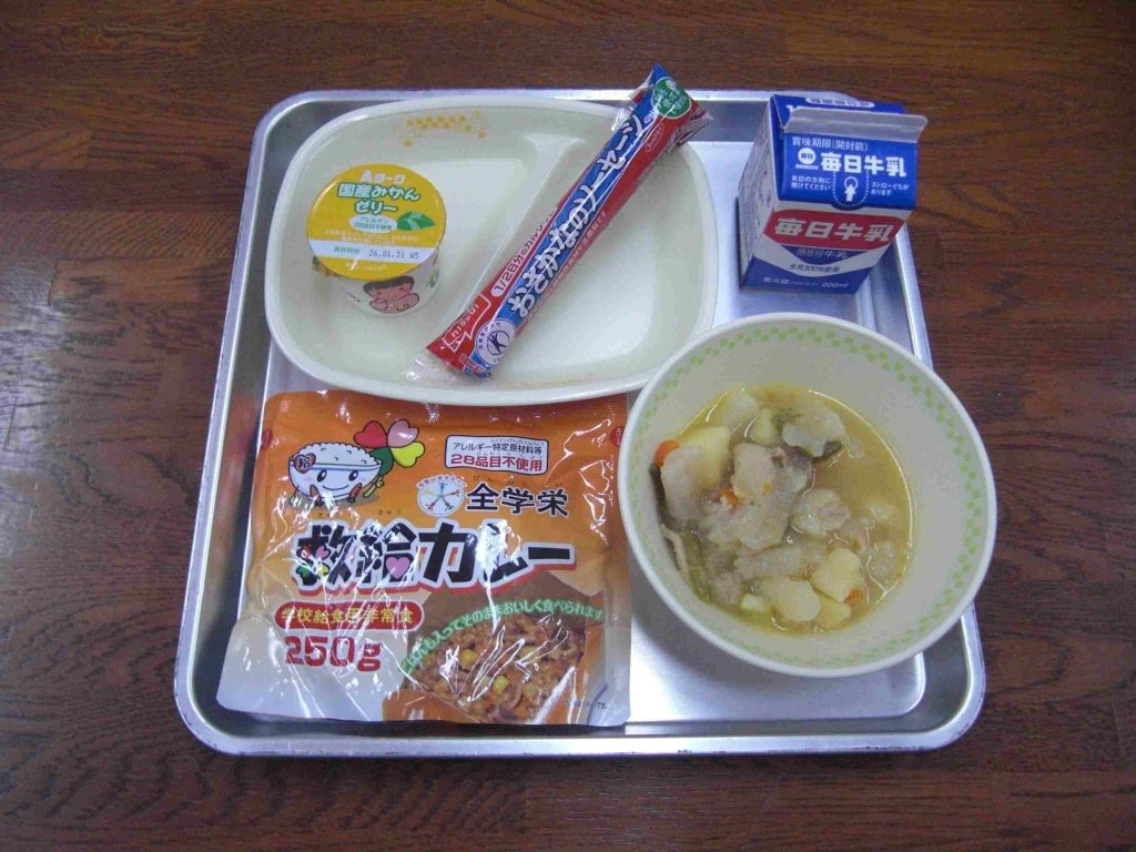 本日の給食は、「防災メニュー(救給カレー、牛乳、お魚ソーセージ、ポトフ、みかんゼリー)」でした。 阪神・淡路大震災が発生してから31年が経ちますが、その後も大きな災害が日本各地で発生しています。2学期に実施した「防災教室」でも学びましたが、「自助・共助」の基本の1つとして防災食を備えることも大切です。そして、その防災食に食べ慣れておくことも必要です。 今日の「救給カレー」は長期保存ができ、そのまま食べられる防災食です。みんなで美味しくいただきました。