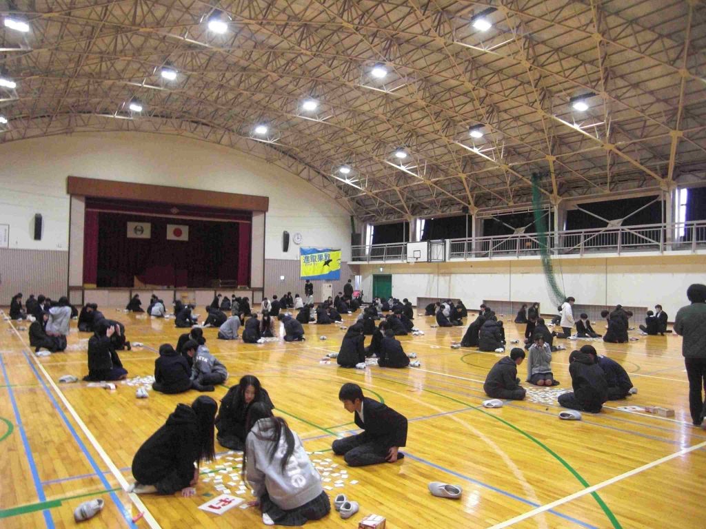 1/23(金)の6校時に、2年生で「百人一首大会」を開催しました。各自が一所懸命覚えた成果を本番で発揮すべく、クラス予選を経て大会に臨みました。和やかな雰囲気の中、札の獲得を目指して皆さんの目は真剣でした。