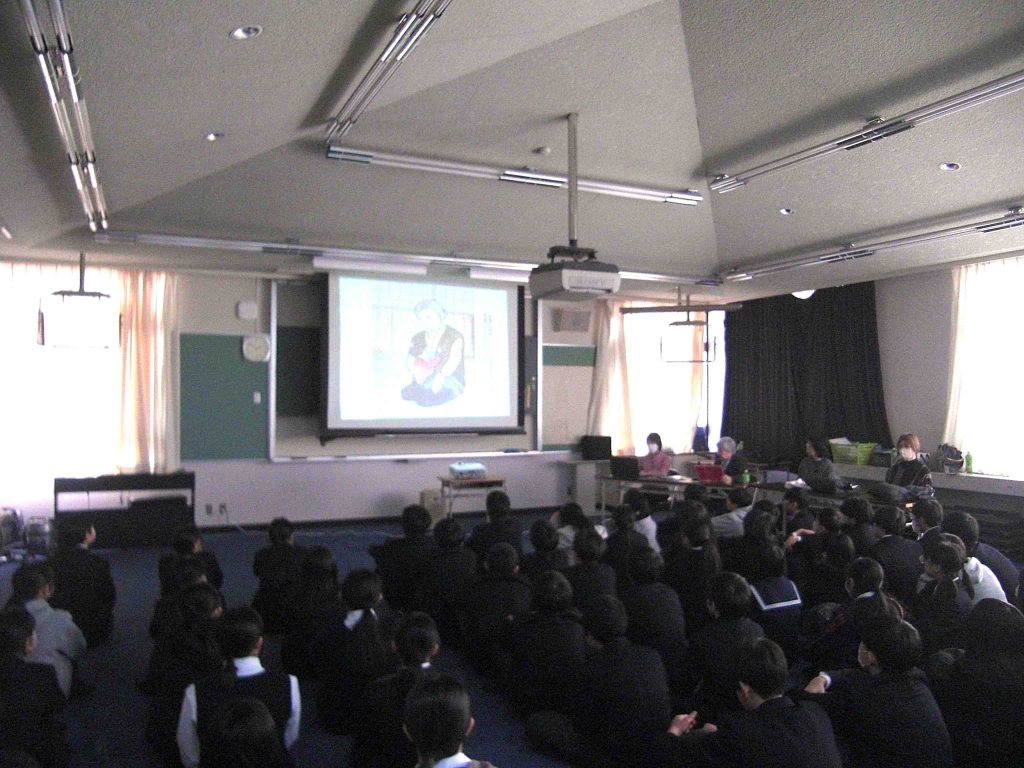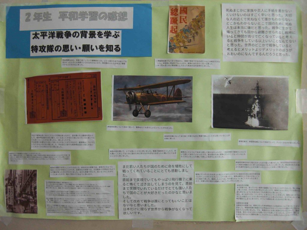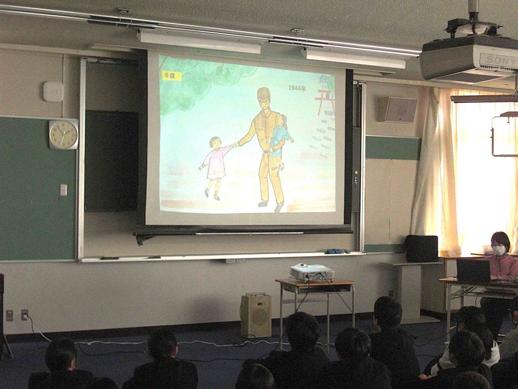 2年生で平和学習を進めています。本日午後は「戦争体験を語り継ぐ会」の方々にお越しいただきました。「戦争体験を語り継ぐ会」は2019年に発足され、今までに小学校や中学校をはじめ、自治体や高齢者施設など多くの場所で活動されています。今回は、戦争体験者から聞き取った内容で作成された紙芝居をもとにお話しいただきました。 2年生は来年度の沖縄修学旅行で、平和の礎や平和祈念資料館の見学、ガマ体験を行います。今日は、戦争の悲惨さを知り、改めて人権・平和が守られる社会について深く考える時間となりました。